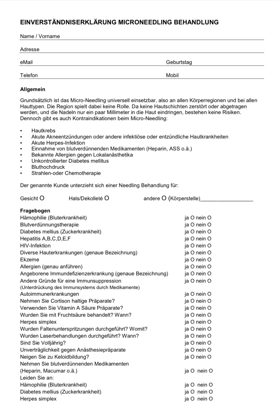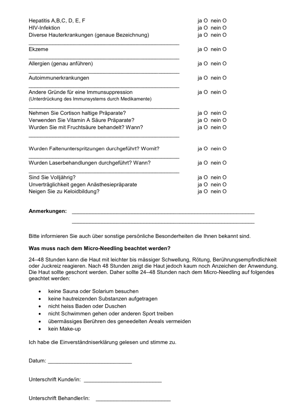 EINVERSTÄNDNISERKLÄRUNG MICRONEEDLING BEHANDLUNG